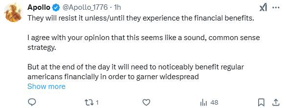 “不论政事态度奈何,任何感性的好意思国东谈主皆无法反对马斯克提议的对于将预算赤字削减一半,并因此促进经济增长的不雅点吧?这些不雅点是基于学问。”