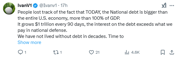 “好意思国的国度债务照旧跨越了统共这个词好意思国经济的限制(跨越100%的GDP),每90天就会加多1万亿好意思元,债务利息以致跨越了国防开支。好意思国几十年来一直生涯在债务中,改革的时机早就到了。”