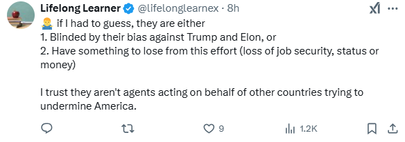 “反对的东谈主要么是因为对特朗普和马斯克有偏见,要么是因为他们从这些变化中会失去某些利益(如使命安全、地位或财富)。”
